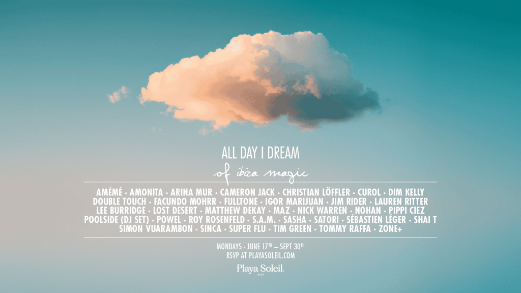 Sobre su nueva residencia Lee Burridge ha comentado: “El verano en Ibiza ya se nos echa encima rápidamente y este año tenemos el placer de acoger 16 fiestas All Day I Dream en Playa Soleil. ¡Alerta de ubicación fantástica! Estoy deseando lanzar el primer tema de lo que promete ser un verano muy especial”.