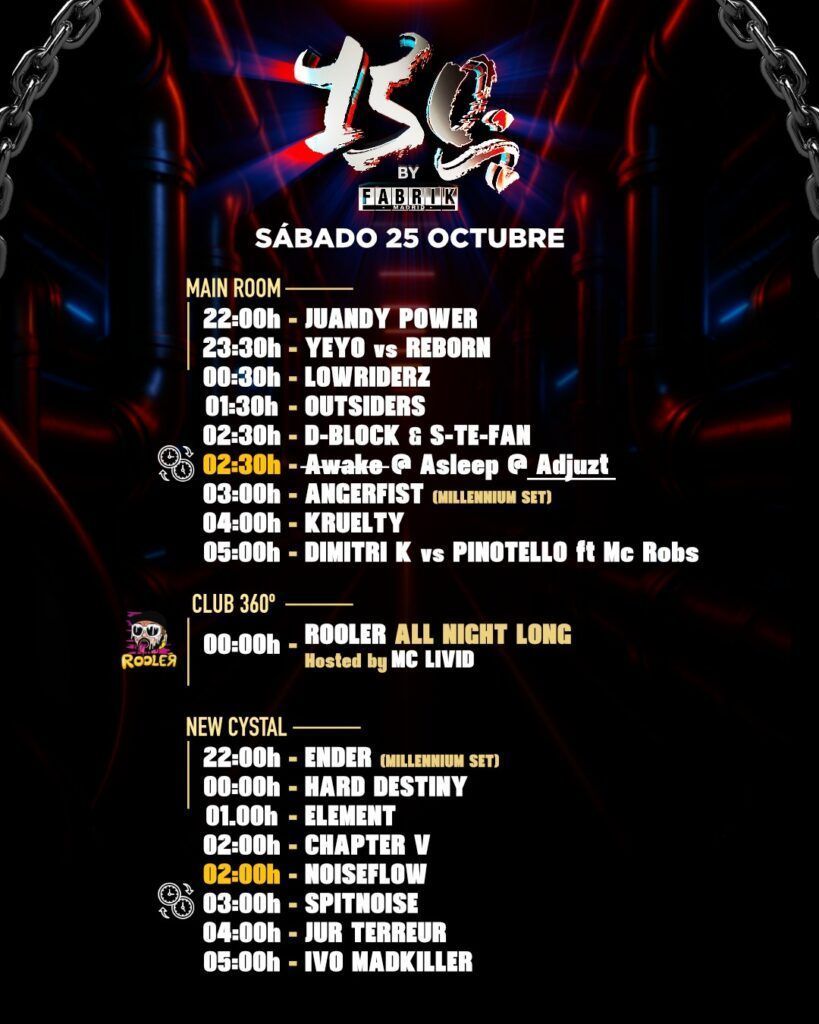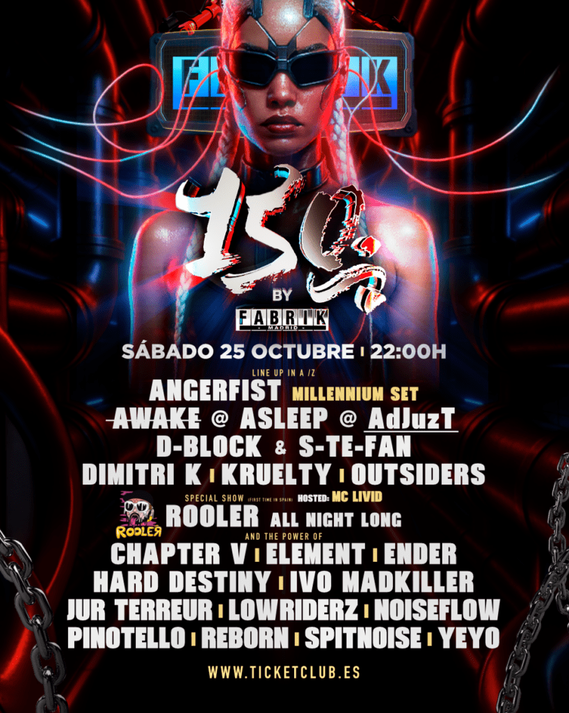 Por si el All Night Long no fuera suficiente, 150 by Fabrik completa su line-up con un cartel cargado de nombres imprescindibles. Entre ellos, destaca un millennium hardcore set especial de Angerfist, la brutalidad sonora de Kruelty, el live salvaje de rawstyle de Adjuzt y el regreso triunfal del dúo D-Block & S-Te-Fan, que promete hacer temblar la pista con su inconfundible estilo.